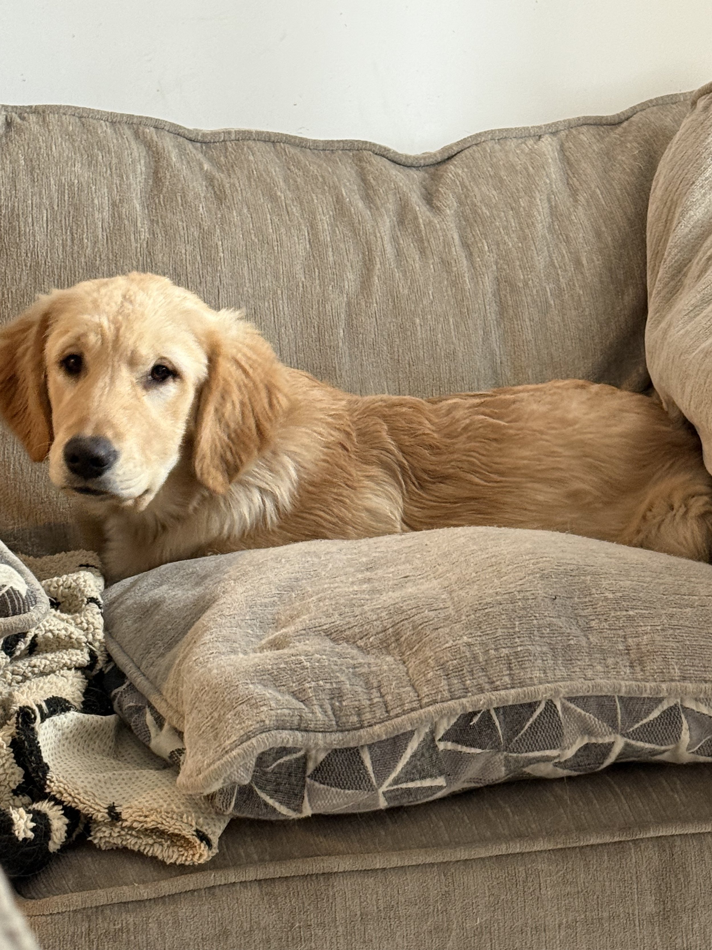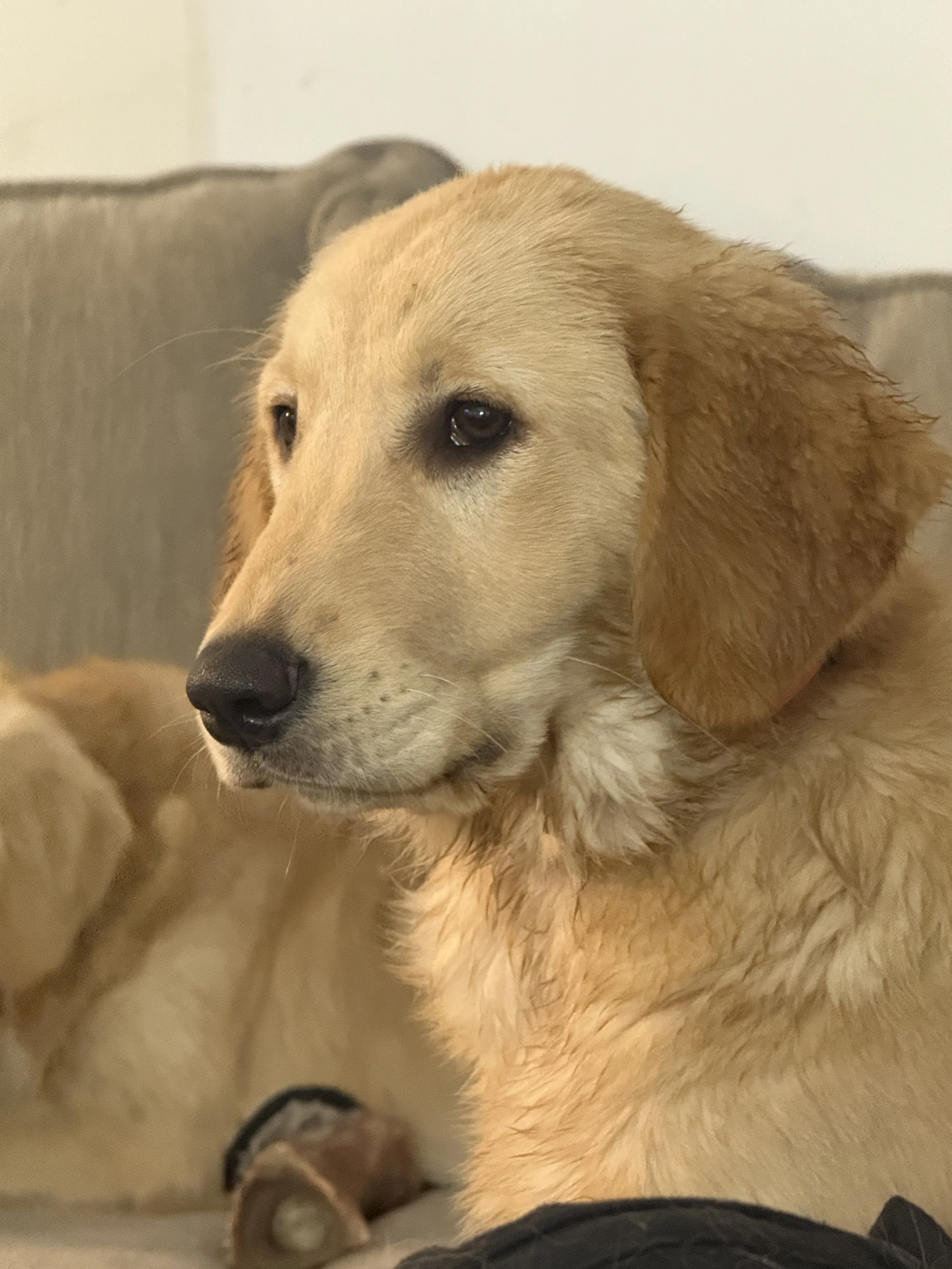 Hi there! My name is Sabine, and I'm a lively 5-month-old golden retriever puppy. One day, I hope to bring beautiful puppies into the world! I'm growing up with my wonderful sister, Padme, and we have a blast together. I love to run and play, and wrestling with my dog friends is one of my all-time favorite activities. When I'm not outside having fun, you can find me cuddling on the couch with my humans, soaking up all the love. My favorite snack is duck jerky, and I'm great with everyone—adults, children, and other dogs. I can't wait to share my happiness with you!